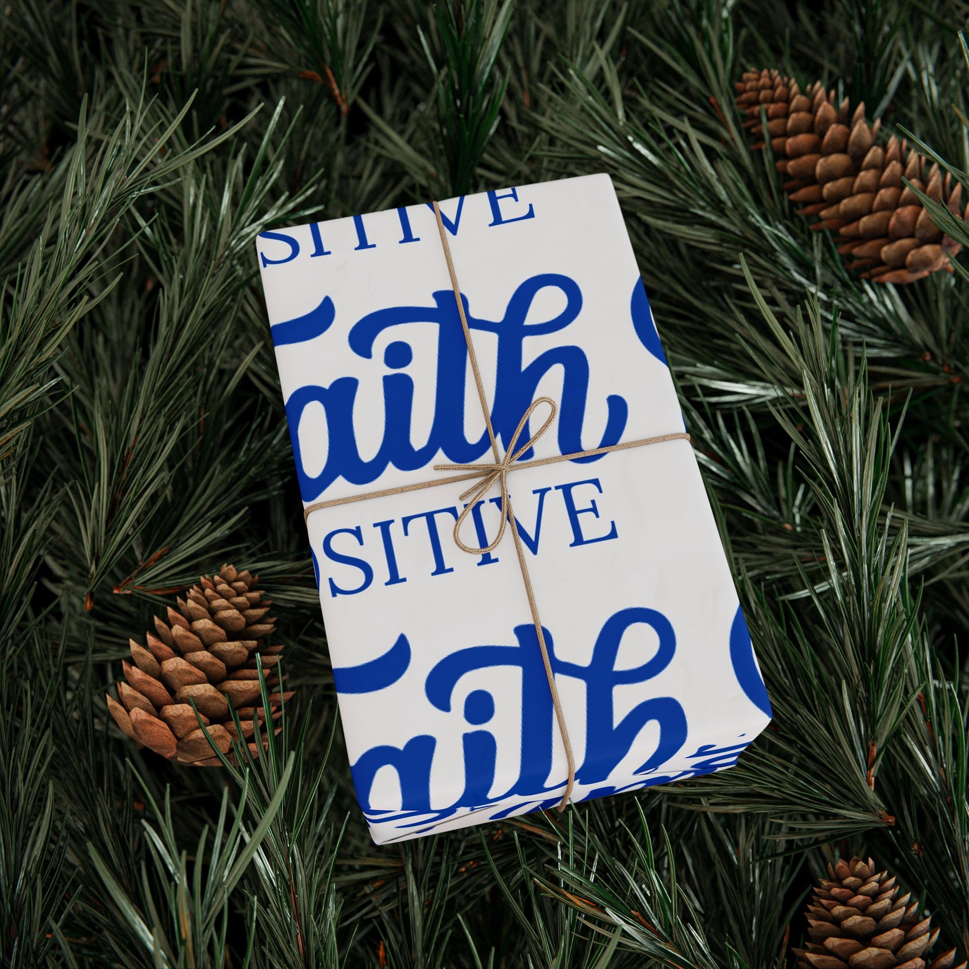 A bright, uplifting wrapping paper printed with repeating hand-lettered “Faith” and smaller “Positive” tags in bold cobalt blue. The design feels cheerful and encouraging — like passing along a small blessing with every wrapped gift. The clean white background keeps the script crisp and modern, while the large, flowing letters add personality and warmth. Use glossy for a polished, reflective finish or matte for a soft, understated look. The generous size options and thick fine-art paper give each present a thoughtful, high-quality feel that suits celebrations where faith and encouragement matter.